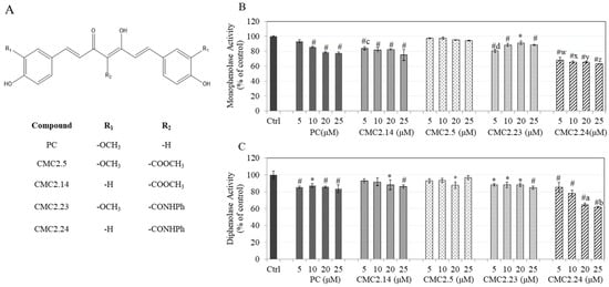 Here, we studied four CMCs: CMC2.14, CMC2.5, CMC2.23 and CMC2.24, which differ in (i) the type of substituent on the central carbon flanked by the β-diketone (methoxycarbonyl vs. phenylaminocarbonyl) and (ii) the presence or absence of a methoxy group on the aryl rings, for their capacity to inhibit tyrosinase enzyme activity and melanin production in B16F10 cells and further elucidate mechanism of inhibition. We have also included the parent compound, pure curcumin (PC; curcumin I) as a reference, which we have shown in our previous study to inhibit melanin levels in B16F10 cells [36]. Our working hypothesis is that of the four CMCs, CMC2.24 would possess the greatest inhibitory activity towards both steps of tyrosinase-catalyzed melanin production as well as the greatest diminution of cellular melanogenesis.