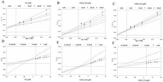 Kinetic analysis of monophenolase inhibition by PC, CMC2.24 and CMC2.23; Lineweaver-Burk plots showing the reciprocal of velocity (1/v) of tyrosinase reaction vs. reciprocal of substrate (1/l-TYR) for (A) PC; (B) CMC2.24 and; (C) CMC2.23; Dixon plots for the inhibition of monophenolase activity of mushroom tyrosinase by (D) PC; (E) CMC2.24 and; (F) CMC2.23 in the presence of different concentrations of l-TYR substrate (0.125, 0.25, 0.5 and 1 mM).
