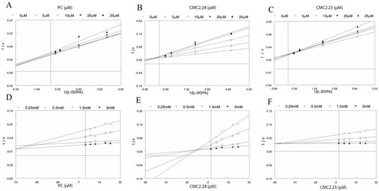 Kinetic analysis of diphenolase inhibition by PC, CMC2.24 and CMC2.23. Lineweaver-Burk plots showing the reciprocal of velocity (1/v) of tyrosinase reaction vs. reciprocal of substrate (1/l-DOPA) for (A) PC; (B) CMC2.23 and; (C) CMC2.23; Dixon plots for the inhibition of diphenolase activity of mushroom tyrosinase by (D) PC; (E) CMC2.24 and; (F) CMC2.23 in presence different concentrations of l-DOPA substrate (0.25, 0.5, 1.5 and 3 mM).