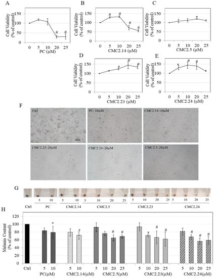 Viability of B16F10 cells treated for 48 h in the presence of different concentrations of PC and CMCs; (A) PC; (B) CMC2.14; (C) CMC2.5; (D) CMC2.23 and; (E) CMC2.24, measured using MTS cytotoxicity assay. * p < 0.05 and # p < 0.01 vs. control; (F) Representative images of B16F10 cells showing the control group and treatment groups (PC and CMC2.14 (10 µM), CMC2.5, CMC2.23 and CMC2.24 (20 µM)); Melanin content estimation with different concentrations of PC and CMCs showing (G) Cell pellet panel shows representative images from one experiment and; (H) quantification of relative melanin levels expressed as % of control. Control was treated with 0.16% DMSO. * p < 0.01 and # p < 0.01 vs. control; One-way ANOVA with Dunnett’s post hoc test; All data are mean ± SD of at least three independent experiments.