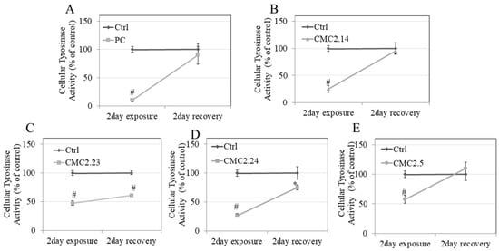 Exposure and recovery study of tyrosinase activity in lysates of B16F10 cells treated with compounds, (A) PC (10 µM); (B) CMC2.14 (10 µM); (C) CMC2.23 (20 µM); (D) CMC2.24 (20 µM), and (E) CMC2.5 (20 µM); # p < 0.01 vs. control at 2-day exposure; # p < 0.01 vs. control at 2-day exposure; * p < 0.05 vs. control at 2 day recovery; All data are mean ± SD (n = 3 per group).