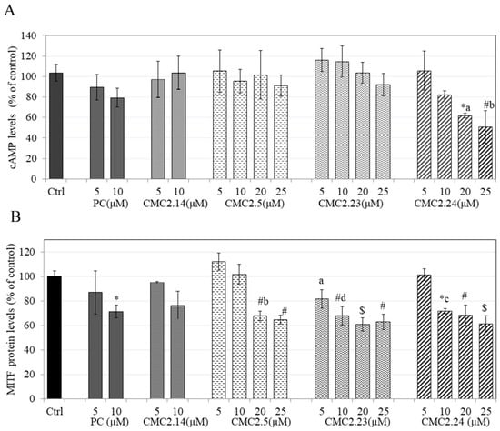 (A) cAMP levels estimated by ELISA in cultures of B16F10 cells treated for 48 h with different concentrations of PC and CMCs, * p < 0.05 and # p < 0.01 vs. control; letter a—p < 0.05 vs. CMC2.5 and CMC2.23 at 20 µM; letter b—p < 0.05 vs. CMC2.5 and CMC2.23 at 25 µM; One-way ANOVA with Tukey’s post hoc test; Data are mean ± SD of at least two independent experiments; (B) MITF protein levels estimated by cell-based ELISA in cultures of B16F10 cells treated for 48 h with different concentrations of PC and CMCs, * p < 0.01; # p < 0.01 and $ p < 0.001 vs. control; letter a—p < 0.05 vs. CMC2.5 (5 µM); letter b—p < 0.01 vs. CMC2.5 (10 µM); letter d—p < 0.01 vs. CMC2.5 (10 µM); letter c—p < 0.05 vs. CMC2.24 (5 µM); One-way ANOVA with Tukey’s test; Data are mean ± SD (n = 3 per group).