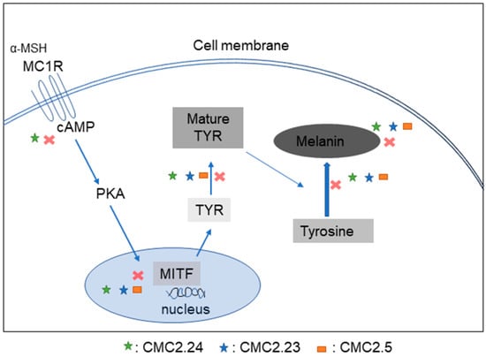 Microphthalmia Transcription Factor (MITF), a known transcription factor for the tyrosinase gene, is a master regulator of melanogenesis and is activated by cyclic adenosine monophosphate (cAMP) signaling after UV irradiation [41], reflecting the role of cAMP as a key maturation factor in melanogenesis [42]. The effects of PC and CMCs on MITF protein levels were assayed using a cell-based ELISA (Lifespan Biosciences, Seattle, WA, USA). Briefly, B16F10 cells were cultured in a 96- well plate at 1 × 104 cells/well for 24 h and then the medium was replaced with fresh medium containing compounds in 0.1% DMSO and cultures maintained for further 48 h. The cells were then fixed, and subsequent steps were conducted according to the manufacturers’ instructions. MITF protein levels were normalized to cell density by measuring the absorbance of crystal violet stain added to the fixed cells and the data was reported as % of control.