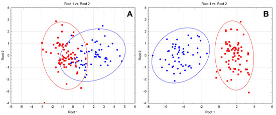 Discriminant analysis score plot of normal body weight (blue) and obesity (red) based on the patterns of metabolic parameters and blood pressure (A) or serum trace elements, metabolic parameters, and blood pressure (B).