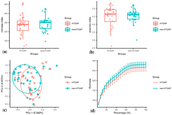 The alpha diversity was assessed using species richness (Figure 1a) and Shannon’s diversity index (Figure 1b). We found no statistically significant difference in the species richness (p = 0.440) and Shannon’s diversity index (p = 0.571) between the HTGAP and non-HTGAP groups, but there was a tendency for reduced richness in the HTGAP group. The PCoA of weighted UniFrac distances for the beta-diversity assessment did not show significant differences in the microbial communities between the HTGAP and non-HTGAP groups (Figure 1c). The rarefaction curves (Figure 1d) of species richness gradually flattened out, which indicated that a reasonable number of individual samples had been taken.