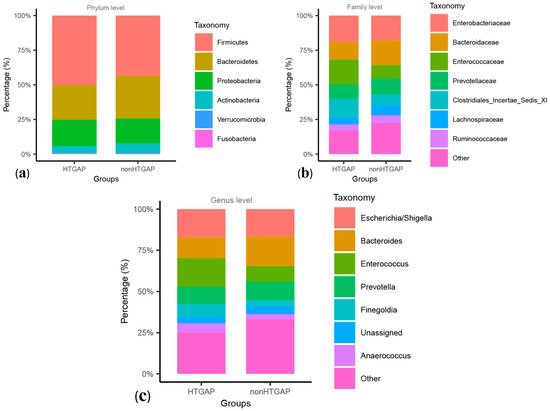 These two groups were composed mainly of Firmicutes, Bacteroidetes, and Proteobacteria at the level of phylum, and Firmicutes were more frequent in the HTGAP group than in the non-HTGAP group, as shown in Figure 2a. At the family level, Enterococcaceae and Clostridiales Incertae Sedis XI were more abundant in the HTGAP group, while Lachnospiraceae and Bacteroidaceae were more abundant in the non-HTGAP group (Figure 2b). At the genus level, the HTGAP group showed a higher relative abundance of Finegoldia and Enterococcus, and a lower relative abundance of Bacteroides when compared with the non-HTGAP group (Figure 2c). A visualization of connections between microbiota composition and groups of patients is depicted in the chord diagram (Figure S2), demonstrating a higher abundance of Bacilli in the HTGAP group as compared to the non-HTGAP group. Figure S3 shows the level structure of intestinal microflora.