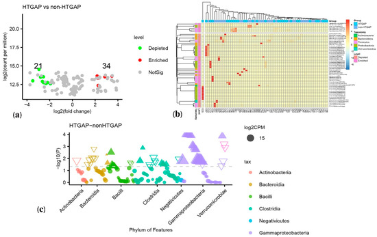 Differential ASVs between HTGAP and non-HTGAP groups. ASV, amplicon sequence variants. (a) Volcano plot. Each point represents an ASV, and significantly different ASVs are colored (green = depleted in the non-HTGAP group; red = enriched in the non-HTGAP group; gray = not significantly enriched or depleted). (b) Heatmap. Rows represent discriminative ASVs, and columns represent individual samples. Blue represents lower relative abundances, and red represents higher relative abundances. The taxonomic assignment and level of abundance (enriched or depleted) are provided to the left of the heatmap. (c) Manhattan plot. The x axis represents the microbial ASV taxonomy at class level ranked by alphabetical order, and y axis represents -log10 (p value). Filled triangles, hollow inverted triangles, and solid circles indicate ASVs enriched, depleted, and without significant difference, respectively. The color of each marker represents the different taxonomic affiliation of the ASVs, and the size corresponds to their relative abundances using log2 transformed CPM values. HTGAP, hypertriglyceridemia-associated acute pancreatitis; ASV, amplicon sequence variants; CPM, count per million.