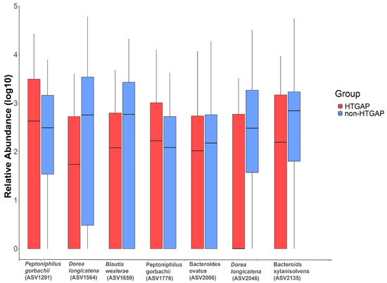 The volcano plot (Figure 3a) and heatmap (Figure 3b) depicted 55 ASVs with significantly different read counts between HTGAP and non-HTGAP groups based on the edgeR analysis, among which 21 ASVs were depleted and 34 ASVs were enriched in HTGAP group as compared with non-HTGAP group. At the phylum level, Actinobacteria and Bacteroidia were enriched, while Bacilli, Clostridia, and Gammaproteobacteria were depleted in the non-HTGAP group compared to HTGAP group (Figure 3c). At the species level, HTGAP group had higher abundances of Peptoniphilus gorbachii (ASV1291) (0.333% vs. 0.126%, p = 0.031) and Peptoniphilus gorbachii (ASV1776) (0.153% vs. 0.057%, p = 0.029), but lower abundances of Dorea longicatena (ASV1564) (0.066% vs. 0.437%, p = 0.008), Dorea longicatena (ASV2046) (0.044% vs. 0.240%, p = 0.020), Blautia wexlerae (ASV1659) (0.064 vs. 0.218, p = 0.046), Bacteroides ovatus (ASV2006) (0.073% vs. 0.131%, p = 0.030), and Bacteroides xylanisolvens (ASV2135) (0.112 vs. 0.360, p = 0.009) when compared with non-HTGAP group (Figure 4).