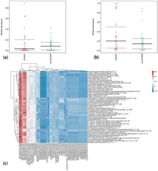 Bugbase analysis was used to explore the differences in bacterial metabolic phenotypes between HTGAP and non-HTGAP groups, and the predictions of oxidative stress tolerance and mobile element containing are shown in Figure 5a,b, respectively. In contrast to the non-HTGAP group, the relative abundance of bacteria containing mobile elements slightly increased in the HTGAP group, but without significance. For oxidative stress, a lower abundance of bacteria with the ability to tolerate stress was detected in the HTGAP group. To analyze the metabolic functional pathways of intestinal microflora, PICRUSt2 was used and the result is shown in Figure 5c. Blautia wexlerae (ASV1332 and ASV1659), Bacteroides ovatus (ASV2006), and Dorea longicatena (ASV1795, ASV1564, and ASV2046) were positively correlated with microbial gene functions related to amino acid metabolism, biosynthesis of secondary metabolites, nucleotide biosynthesis, NAD+ kinase, glutamate synthase (NADPH/NADH) small chain, 4-alpha-glucanotransferase, formate C-acetyltransferase, and glycogen phosphorylase.