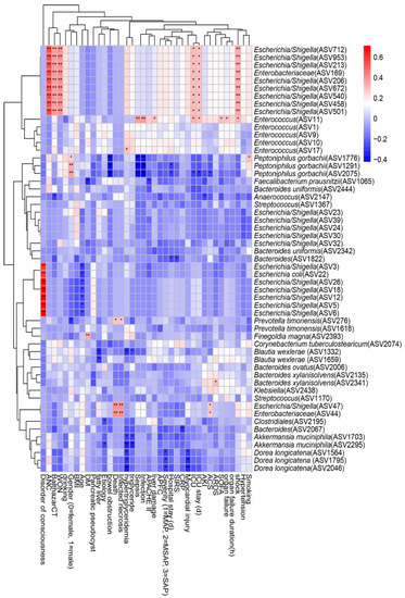 Spearman correlations between differential ASVs and clinical outcomes as well as indicators of disease severity. ASV, amplicon sequence variants; ANC, acute necrotic accumulation; WON, walled-off necrosis; BMI: body mass index; DM, diabetes mellitus; APACHE II: the Acute Physiology and Chronic Health Evaluation II score; APFC, acute peripancreatic fluid collection; MAP: mild acute pancreatitis; MSAP: moderately severe acute pancreatitis; SAP: severe acute pancreatitis; SIRS: systemic inflammatory response syndrome; CRP: C-reactive protein; ICU: intensive care unit; AKI: acute kidney injury; ACS: abdominal compartment syndrome; ARDS: acute respiratory distress syndrome; SOFA: the Sequential Organ Failure Assessment score. The strength of positive (red) or negative (blue) correlation is shown by two-color heatmap, with asterisks denoting statistical significance (* p < 0.05, ** p < 0.01).