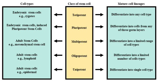 Further classification of stem cells appreciates their differentiation potency (Figure 1). As a new organism develops, most of its cells gradually lose their potential and become more specialized. The zygote provides embryo cleavage cells with the highest differentiation potential. This type of stem cell is described as totipotent because it is capable to form both embryo and extraembryonic structures, such as the placenta. About 4 days after fertilization, the embryo transforms into the blastocyst stage, in which a group of cells, called inner cell mass (ICM), become pluripotent. Pluripotent stem cells lose the ability to differentiate into extraembryonic structures; however, they may form cells of all three germ layers, namely ectoderm, mesoderm, and endoderm, from which stems every tissue and organ upon further development. As this process continues, the number and potency of stem cells in the organism decrease. In most adult tissues, multipotent cells can be found. This type of cell differentiates into single germ layer-derived tissues, for example, mesenchymal stem cells (MSCs) give rise to mesoderm-derived tissues, such as muscle, bone, cartilage, or adipose tissue. While differentiating, multipotent cells gradually become oligopotent, as their differentiating potential reduces to several cell lineages (hematopoietic stem cells, e.g., form myeloid or lymphoid cell lines). Eventually, the last type of stem cell arises in the process of specialization to unipotent cells, capable to give rise to only one specific cell type. Unipotent cells still have the ability to self-renew, contrary to progenitor cells, which can only transform to one type of cell [13]. The characteristics of stem cells are presented in Table 1.