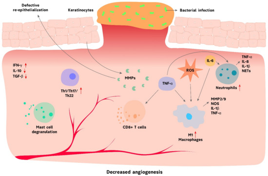 Immune and structural cells actively express and regulate cytokines, chemokines and growth factors during the wound repairing process [100]. For example, an elevated level of IFN-γ, VEGF and soluble VCAM-1, observed in patients with DFU, promotes the healing of ulcers [105]. However, certain factors are dysregulated in non-healing wounds, which is partly responsible for the pathogenesis of the injury. Mice with IL-36 receptor antagonist deficiency showed delayed wound healing due to the overproduction of IL-36γ, TGF-β and CXCL1, redundant infiltration of neutrophils and macrophages and excessive granulation tissue formation [106]. Additionally, the chemokine receptor CCR4 negatively affects chronic wounds caused by diabetes mellitus. CCR4-depleted diabetic mice showed reduced expression of cytokines that promote wound repair, such as IL-6, IL-12, IL-1β, TNF-α and IL-10 [107]. Another study revealed the impaired regulation of transcription factors FOXM1 and STAT3 in patients with DFU. FOXM1 and STAT3 are responsible for the proliferation of macrophages and neutrophils and for their recruitment to diabetic wound microenvironments. Therefore, the inhibition of those factors in DFU patients contributes to the pathogenesis of the disease through the defective recruitment of immune cells [108]. Another factor that facilitates a delay in wound healing is MMP [109]. During normal wound healing, cells in the injured area, such as fibroblasts, keratinocytes and immune cells, are induced by local mediators to secrete MMPs. Those mediators include various cytokines and growth factors involved in wound healing, such as TGF-β, VEGF, EGF, interleukins and interferons [110]. MMPs are normally required in a small amount and are responsible for proper epithelization and proliferation. However, their dysregulation leads to impaired epithelialization and is strongly associated with hard-to-heal wounds (Figure 2) [111]. As such, an increased expression of MMP-9 by activated neutrophils is linked to delayed ulcer repair in diabetic patients [112]. Moreover, high glucose can stimulate the overexpression of MMP-9 via the activation of the ERK/AP1 signaling pathway [113]. Overall, chronic wound healing occurs when the immune system fails to proceed through the normal repairing process, resulting in prolonged presence of neutrophils and pro-inflammatory macrophages in the injured skin, which promotes inflammation, tissue fibrosis and poor vascularization.
