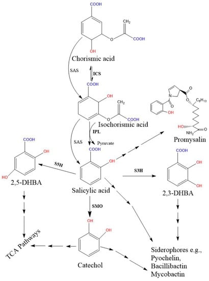 The biosynthesis of SA and its functions in plants have now been completely understood through two breakthrough studies [47,48]. However, knowledge on microbial SA biosynthesis is still scarce, and their functions are yet to be elucidated. In plants, SA functions as a hormone, regulating several physiological processes, such as biotic and abiotic stress responses, seed germination, and flowering [6,24,25]. Meanwhile, in bacteria, SA is mainly associated with salicyl-derived siderophores [49,50], and some of its derivative compounds also act as antibacterial agents, e.g., promysalin [51]. Salicyl-derived siderophores are produced by few plant-growth-promoting rhizobacteria and pathogenic bacteria [52,53]. Considering the practical importance of SA, the objective of this study is to investigate the occurrence of bacterial salicylate, its biosynthetic pathways, and compare with plant SA biosynthesis. Herein, we have illustrated bacterial salicylate production with two crucial examples. Overall, this review confirms that bacterial salicylate is directly correlated with salicylate-derived siderophore biosynthesis.