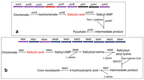 Pyochelin siderophore is made from one molecule of SA and two molecules of cysteine by a thiotemplate mechanism. In Pseudomonas aeruginosa, the biosynthesis of pyochelin takes place by the BGC comprising pchDHIEFKCBA operon [135,136,137]. Two enzymes, pchA (ICS) and pchB (IPL), start the synthesis. Chorismate is converted to isochorismate by the pchA and subsequently, the isochorismate is converted to salicylate by pchB. Subsequently, salicylate is activated by pchD (salicyl-adenylating enzyme). In the meantime, enzyme pchC (encoded for type II thioesterase) removes wrongly charged molecules. Afterward, two tailoring enzymes (pchE and pchF) add L-cysteine residues and perform cyclization and epimerization, resulting in the formation of an intermediate product. Finally, the action of pchK (saccharopine reductase) results in pyochelin synthesis (Figure 3a).