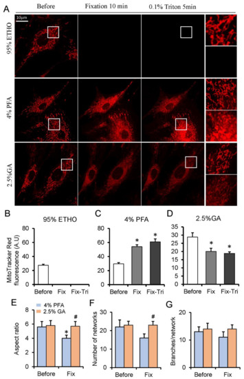 MitoTracker Red fluorescence assay on fixed and permeabilized cells. (A) Representative images of the MitoTracker Red fluorescence after fixed by paraformaldehyde (PFA), glutaraldehyde (GA), or ethanol (ETHO), and permeabilized by Triton. (B–D) Quantity result of MitoTraker Red fluorescence before and after fixed by ETHO, PFA or GA, and permeabilization. (E–G) Quantitative result of mitochondrial morphology and network. Fix, fixation; Fix-Tri, fixation followed with Triton. Mean ± SEM, n = 9–12 cells. * p < 0.05, compared with Before; # p < 0.05, compared with 4% PFA Fix. The data analyzed by one-way ANOVA.