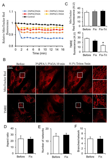 Screening the ratio of PFA and GA. (A) Representative traces of the MitoTracker Red fluorescence during fixation. (B) Representative images of the MitoTracker Red and TMRE fluorescence after fixed by PFA-GA, and permeabilized by Triton. (C) Quantitive data of MitoTracker Red and TMRE fluorescence. (D–F) Quantitative result of mitochondrial morphology and network using MitoTracker images. Fix, fixation; Fix-Tri, fixation followed with Triton. Mean ± SEM, n = 9–12 cells. * p < 0.05. The data analyzed by one-way ANOVA.