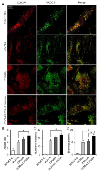 Immunostaining assay after fixation. (A) Representative images of the COX IV and VDAC1 immunostaining after fixed by PFA, GA, ETHO, or PFA-GA. (B–D) Quantitative result of mitochondrial morphology and network. Mean ± SEM, n = 9–12 cells. * p < 0.05. The data analyzed by one-way ANOVA.