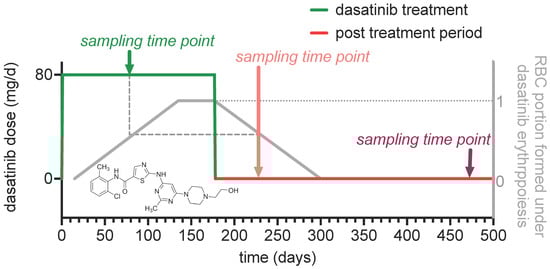 We do not know if dasatinib has a direct effect on the mature red blood cells (RBCs) or if it acts exclusively on erythropoiesis [7], which would not be unusual for drugs that manipulate kinase activity [23]. Therefore, we provide an estimation of the portion of RBCs in the circulation which were ‘produced’ in the presence of dasatinib (grey curve in Figure 1). This is based on the observation of in vivo cohort labeling experiments [24]. When glycine containing a rare isotope is orally administered, RBCs containing the labelled glycine appear in the circulation about 15 days later and show an average lifetime of 115–120 days [24]. As a result, the portion of RBCs formed under dasatinib treatment is similar for the sampling during dasatinib treatment and the first sampling after treatment (dashed line in Figure 1).