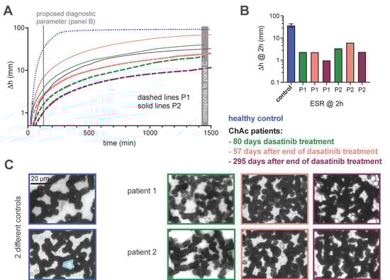 Measurements of the ESR with the standard Westergren method using EDTA blood. (A) Plots of the color-coded sedimentation curves retrieved from optical images taken every minute, i.e., the density of the data points corresponds approximately to the printed resolution. (B) Comparison of the sedimentation height after 2 h, which was proposed to be a diagnostic biomarker [10]. Please note that panels (A,B) are logarithmic plots. (C) Representative micrographs of sedimented RBCs forming aggregates on a coverslip. RBC are diluted in plasma, forming a hematocrit of approximately 45% in the 2D layer on the coverslip. The cyan-framed area is an example to indicate a ‘hole’.