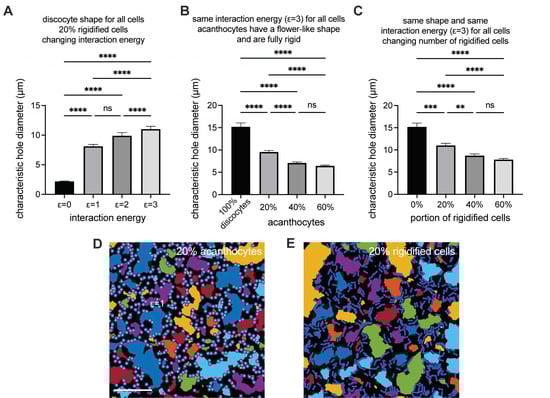 2D modeling of RBC aggregation to better understand the dependence of characteristic hole size on the aggregation strength and fraction of acanthocytes. The larger the hole size, the faster the ESR. (A) Panel A shows hole sizes when only the interaction energy varies. An increase in the interaction energy mimics an increase in the plasma protein concentration, mainly the fibrinogen. (B) Panel B represents the situation of a variable number of acanthocytes, whereas acanthocytes have a different shape and are completely rigid. (C) Panel C depicts the situation when the interaction energy is constant, and all cells have the same discocyte shape, but the number of rigidified cells increases. ** refers to a significance level of p < 0.01, *** to p < 0.001 and **** to p < 0.0001. The abbreviation ns stands for not significant. (D,E) are example images for 20% acanthocytes and 20% rigidified cells respectively, as presented in panels (B,C). For a better visualization, the holes are marked in a variety of false colors. The scale bar refers to 100 µm.