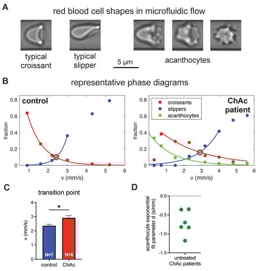 Figure 5A presents representative images of the normocyte cell shapes of croissants and slippers (left images) in comparison to the acanthocytes in flow (right images). Figure 5B shows the phase diagram of the cell shapes (croissants, slippers and acanthocytes) as a function of the flow velocity in the microfluidic channel for a representative healthy control (left) and a representative ChAc patient (right). In the control, no acanthocytes were detected. However, in both cases, the number of croissants increases for increasing flow velocity, while the number of slippers decreases. If RBCs have an increased rigidity (decreased deformability), increased flow stresses (or larger flow velocities) are required for the transition from croissants to slippers. To obtain a quantitative measure of this transition independently of the total number of cells, we define the transition point as the speed when the number of croissants equals the number of slippers. To avoid the influence of errors in single measurement points, we performed a fit on all points within the exponential decay or the exponential growth of the croissants and slippers respectively, and determined the transition point as the intersection of the fitting curves (brown circles in Figure 5B). The statistical comparison of 6 ChAc patients and 7 healthy controls revealed a significant difference, as shown in Figure 5C. This indeed indicated a difference in the deformability, such that normocytes of ChAc patients are on average less deformable than those for healthy controls.