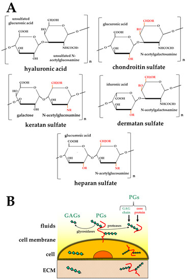 (A) Chemical structures of the disaccharide units composing the five main classes of GAGs. In red, “R” indicates potential points of sulfation. (B) Schematic representation of the distribution of GAGs/PGs inside the cell, on its surface, in the ECM or in body fluids.