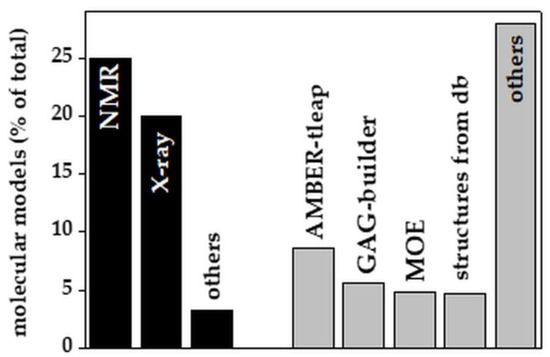 Among the in silico molecular modeling software packages, AMBER-tleap, GAG-builder and MOE are the most frequently used. Significant is also the use of public databases (PubChem, Zinc, DrugBank, EMBL-EBI, KEGG, GAG-databases, monosaccharides databases) and in-house libraries, including FDA-approved drugs, pseudo-disaccharide libraries and LOPAC [80], that provide both 2D and computed 3D structures of GAGs. It must be pointed out that the molecular modeling of GAGs remains a time-consuming process that still requires tedious manual refinements [81]. Additionally, although these methods allow the modeling of long GAG chains [82], the study of their interaction with other biomolecules remains challenging.