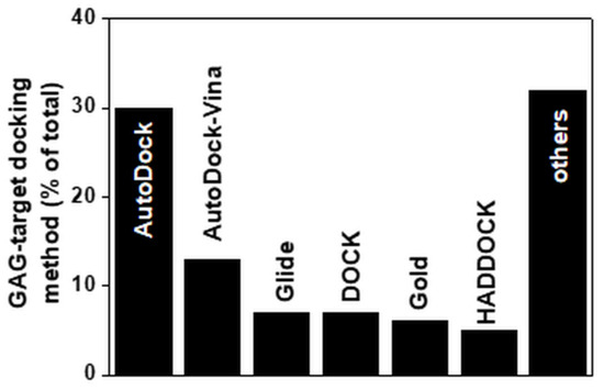 Docking software programs used to predict models of GAG complexes with their targets. Each bar reports the percentage of the published papers in which the indicated software programs were used. For the software programs grouped under “others”, see Table 2. For further details on the bibliographic research strategy, see Appendix A.