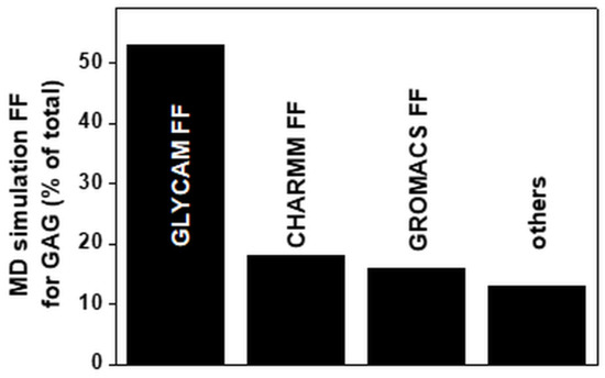 FFs used for MD simulations of GAGs alone or in complexes with targets. Each bar reports the percentage of papers in which the indicated FFs have been employed. For the FFs grouped under “others”, see Table 2. For further details on the bibliographic research strategy, see Appendix A.