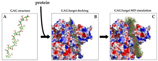 Among the computational methods that can boost the understanding of how GAGs/PGs bind to proteins, particularly promising are molecular modeling, docking and molecular dynamics (MD) simulations. In effect, by working in a virtual environment, these methodologies benefit from a high resilience and potential for high throughput [7,8,9,10]. Briefly, molecular modeling uses molecular mechanics models to construct three-dimensional molecular structures; molecular docking gives favorable arrangements of molecules in complexes (e.g., GAG/protein complexes); MD simulations reproduce the dynamic behavior of individual molecules or complexes. Put in simple terms, the relationship between molecular modeling and MD simulations is similar to that existing between photography and cinematography: the former describes the structure of a molecular system, usually at an atomic detail level, in a “static” way. The latter instead allows the description of the dynamic behavior of a molecular system through the solution of Newton’s equations of motion using the classical laws of physics. In this way, MD simulation acts as a “computational microscope” that provides a “real-time visualization” of phenomena such as peptide folding, protein conformational changes and protein–protein interactions considering the flexibility of the molecules and the possible conformational changes induced by mutations or by the perturbation of the environment (e.g., modification of the pH or of the salt concentration [11,12]).
