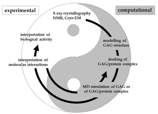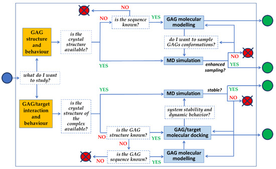 The full potential of molecular modeling, docking and MD simulations can be achieved by following the line of sequential queries schematized in Figure 8. The full set of information that can be retrieved relates not only to the 3D structure of GAGs, but also to their binding modes to targets, their binding thermodynamics and kinetics, possible allosteric effects and mechanistic insights.