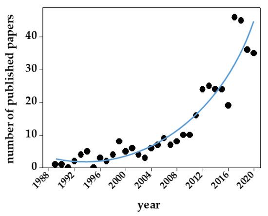 Number of papers containing computational studies of GAGs/PGs published since 1985. For further details on the bibliographic research strategy, see Appendix A.
