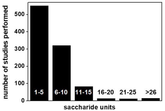 Despite some important technical progress in computational studies of GAGs (reviewed in [9] and listed in Table 2), up to 89% of GAG computational studies so far reported deal with short polysaccharide chains (from 10-mers down to 1-mer) (Figure 10).