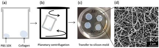 Collagen-based gels were prepared in PBS 10× with a concentration (6.2 mg.mL−1 in HCl 0.64 mM) selected to ensure gel formation in the time course of high magnetic field exposure (6 h). Collagen and PBS were deposited at the bottom of a plastic pot in a 9:1 v:v ratio (Figure 1a), and mixing with planetary centrifugation was implemented to ensure the formation of a homogeneous gel and avoid air bubbles (Figure 1b). The resulting viscous mixture was transferred into a silicon mold (Figure 1c). After dehydration, a self-supported film was obtained, with a thickness of ca. 40 µm showing a homogeneous entangled collagen fibril network (Figure 1d).