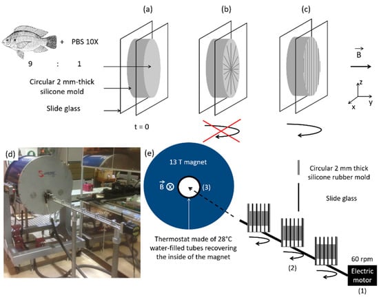For the preparation of collagen-SiNP bionanocomposites, SiNPs were first weighted, diluted in ethanol and put under sonication (Elma S30 Elmasonic instrument working at an ultrasonic frequency of 37 kHz and an ultrasonic power effective of 80 W) until obtention of a homogeneous suspension. The SiNP suspension was added to the acidic solution of collagen under stirring so as to reach a final SiNP concentration of 5 mg.mL−1. After depositing collagen or collagen-SiNPs suspension and PBS in a plastic pot, a planetary centrifugal bubble free mixer (Thinky Inc., Laguna Hills, CA, USA.) was used during 30 s at 2000 rpm to mix collagen or collagen-SiNPs and PBS solutions, and 30 s at 2200 rpm to degas the viscous mixture (Figure 1). Then, a Microman micropipette was used to introduce 800 µL of the resulting solution in the silicone rubber mold between two slide glasses. Six silicone molds were introduced in a suitable plastic beaker. Three of these beakers were placed on the three slots for stirring on the bench (Figure 2). Care was taken towards the best alignment of the beakers along the direction of magnetic field, i.e., along the cylindrical hole inside the magnet. The 60 rpm rotation was tested before starting experiment thanks to a VEXTA OPX-1 motor (Oriental Motors), and the bench was introduced into the JASTEC superconductor 13 T magnet until the middle beaker is located at 282 mm from the entrance, where the magnetic field is actually equal to 13 T (both other beakers face a 12 T magnetic field). Before preparing the composite solutions, the thermostat made of 28 °C water-filled tubes was introduced inside the magnet and water heating was turned on.