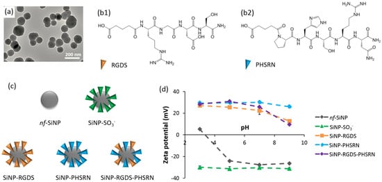 (a) TEM image of nf-SiNP. (b1,b2) Molecular structures of the RGDS and PHSRN peptides. (c) Scheme of the different SiNP surface chemistries. (d) Characterization of SiNPs by zeta potential measurements.