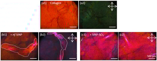 In presence of SiNP-SO3−, no difference of contrast between the two polarizer orientations was evidenced (Figure 4c1,c2). This indicates a more general loss of collagen network organization upon introduction of these particles.