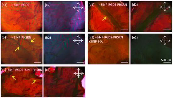 The absence of clusters and the presence of fibril bundles were also observed when mixtures of SiNP-RGDS and SiNP-PHSRN or bifunctionalized SiNPs were present (yellow arrows in Figure 5c1,d1). However, for these two biocomposites, the lack of contrast between the two polarizers positioning signs for the disorganization of collagen within the films, similarly to (collagen + SiNP-SO3−) biocomposites (Figure 4c1,c2). Unexpectedly, when combining these conditions within a single bionanocomposite, i.e., (collagen + SiNP-RGDS-PHSRN + SiNP-SO3−), a rather homogeneous material could be observed, lacking nanoparticle clusters and exhibiting a strong birefringence (Figure 5e1,e2).