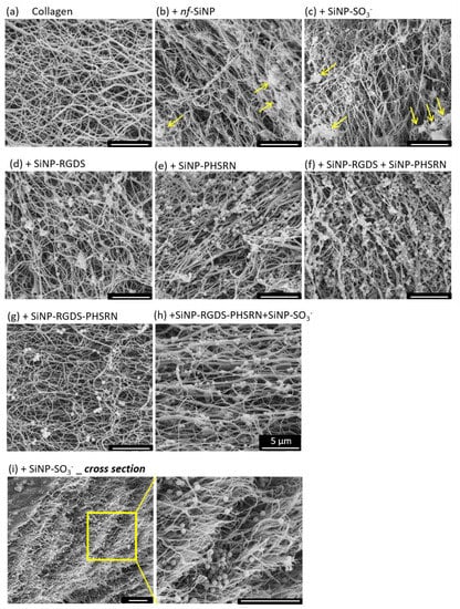 SEM images of (a) collagen, (b) + nf-SiNP, (c) + SiNP-SO3−, (d) + SiNP-RGDS, (e) + SiNP-PHSRN, (f) + SiNP-RGDS + SiNP-PHSRN, (g) + SiNP- RGDS-PHSRN, and (h) + SiNP-PHSRN-RGDS + SiNP-SO3−, and (i) cross section of the collagen + SiNP-SO3−biocomposite. Yellow arrows indicate nanoparticle aggregates. The scale bar is 5 μm for all images.