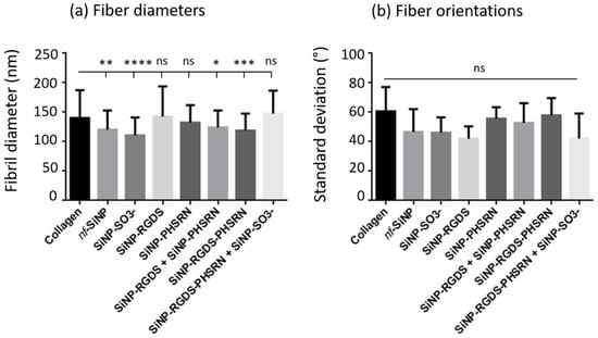 (a) Fibril diameters and (b) orientations measured from SEM images (performed with ImageJ software on 50 fibers for each condition). Statistical tests realized using ANOVA (Dunnett) parametric test. Each column represents mean with SEM (ns _ non-significant_ p > 0.05; * p ≤ 0.05; ** p ≤ 0.01; *** p ≤ 0.001, **** p ≤ 0.0001).