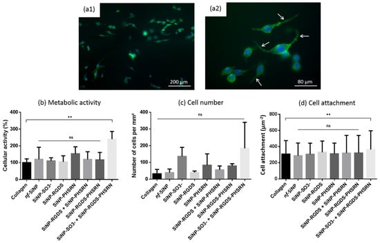 The 3T3 fibroblast cells were seeded on the different bionanocomposites and their adhesion and proliferation investigated by immunostaining of actin cytoskeleton and nuclei (Figure 8). The spreading of fibroblasts on the different biomaterials, characterized by a spindle-like shape morphology with clearly visible stress fibers (Figure 8a2, white arrows), shows that those magnetically-aligned bionanocomposites are perfectly suitable for cell adhesion and spreading. Alamar blue assay revealed that only the (collagen + SiNP-RGDS-PHSRN + SiNP-SO3−) bionanocomposites induced a significantly different, and superior, metabolic activity of the cells after 24 h compared to pure collagen (Figure 8b). Cell number presented no significant difference between all biocomposites investigated but high standard deviations were noticed for several samples (Figure 8c). Finally, in terms of cell attachment, as evaluated by measurement of cell area, the (collagen + SiNP-RGDS-PHSRN + SiNP-SO3−) bionanocomposites was again the only one showing a significant and improved cell behavior (Figure 8d).