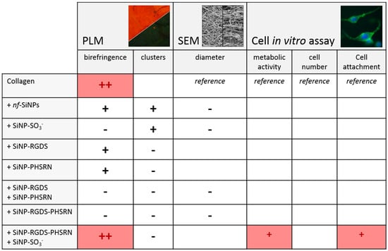 Bionanocomposites can be advantageously designed to enhance the performances of (bio)materials by playing at the structural level and/or by providing additional functionalities. This can be typically achieved by combining biological scaffolds and biofunctionalized silica nanoparticles, as recently reported [,]. The processing of the materials can also be used to further tune their properties. This is the case with the use of high magnetic field that has been shown to control the alignment of fibers in collagen biomaterials [,,,,]. Here, we have combined the magnetic alignment of collagen fibers with the incorporation of functionalized SiNPs able to modify scaffold structure and/or to confer signaling abilities to the composite materials. Figure 9 summarizes the structural features as revealed by PLM and SEM for the eight bionanocomposites investigated, together with their biological performances in terms of adhesion and spreading of fibroblasts. From these data, several points can be discussed: