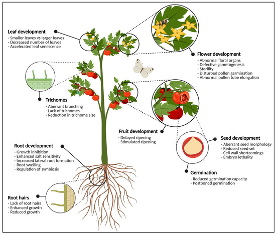 Graphical representation of the most important plant organs. The plant in this figure is generic and does not necessarily represent tomato. For each organ, the most significant phenotypical traits when glycosylation enzymes are knocked-out, knocked-down or over-expressed are highlighted. In the flowering parts, defects in glycosylation cause abnormal development of anthers and pistils, pollen tube germination and elongation, and defective gametogenesis which often leads to sterility. At the level of the fruit, glycosylation enzymes are important for fruit ripening and softening. Seeds show aberrant seed morphology, seed set, (embryo) lethality and cell wall defects when the expression of one or more glycosylation enzymes is disturbed. Vegetative tissues such as the leaves and the roots also experience morphological changes due to aberrant protein glycosylation. This figure was created with BioRender.com.