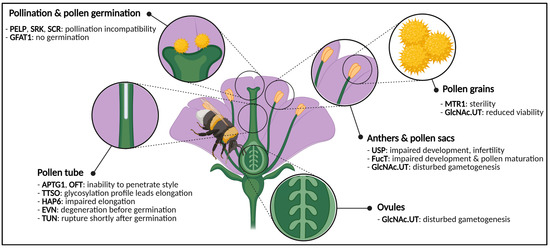 Taken together, both N- and O-glycosylation are of importance during the development of the flowers’ reproductive organs. If glycosylation of glycoproteins fails, flower organs cannot develop properly, gametes end up infertile or fertilization is blocked by pollen tube problems (Figure 3).