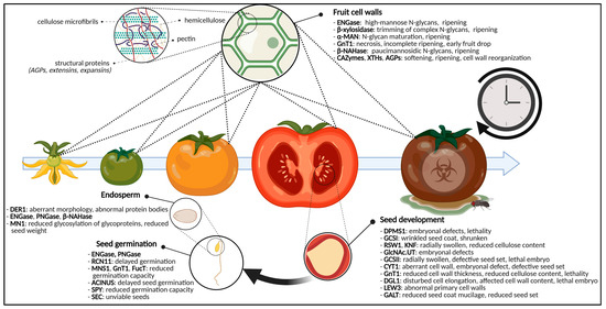 The ripening process is (epi)genetically, hormonally and environmentally driven, and requires the action of specific pathways that contribute to morphological and sensory properties [187,188,189,190,191]. On a biochemical level, fruit ripening is associated with general softening, caused by enzymatic (i.e., by means of CAZymes) and non-enzymatic (i.e., by means of expansins) cell wall degradation and rearrangement. In addition, also color development, flavor formation and increased pathogen susceptibility coincide with the fruit ripening process [191,192,193,194]. In the next paragraphs, the specific role of glycosylation and glycoproteins in the developmental process of fruit ripening is discussed.