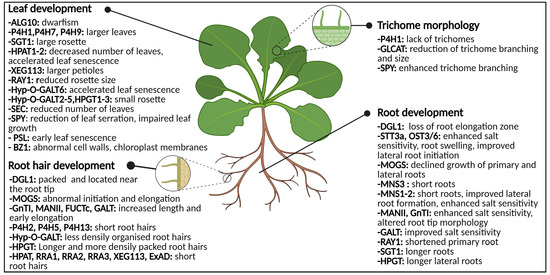 The importance of glycosylation for flowers, fertilization, seeds, developing embryos, germinating seeds and developing roots and leaves is illustrated by the multitude of research articles addressing this topic [7,24,44,49] (Figure 1). Most of these reports make use of mutant plants, mostly in Arabidopsis thaliana L., in which one or multiple proteins involved in the glycosylation pathway are knocked out, knocked down or over-expressed, allowing to view which modifications play a crucial role in the glycosylation pipelines.