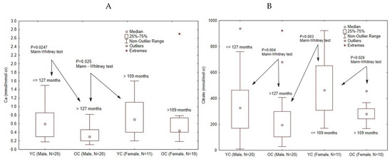 Possible gender differences between subgroups were tested by the Kruskal–Wallis test and Bonferroni multiple comparisons. Differences between female YC vs. OC male groups (p = 0.008) were further test by post-hoc Mann–Whitney U test in accordance with cut-off values to our gender median (female 109 mo. and male 127 mo.). Significant differences were found for Ca (female YC vs. male OC and male YC vs. male OC) in section (A) and Cit excretion (female YC vs. male OC, female YC vs. female OC, and male YC vs. male OC) in section (B).