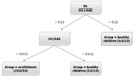 To optimally classify healthy children vs. children with urolithiasis J48 classifier was applied (Figure 2). Only healthy OC vs. OC with urolithiasis are successfully classified. J48 classifier uses Ox/Cit × GAG and Ca/Cit ratios to discriminate between OC with urolithiasis from OC healthy children. The classification tree has two decision nodes and three decision leaves (Figure 2 and Table 4).