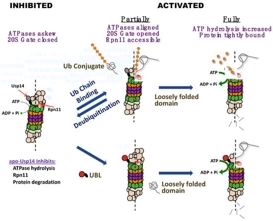 26S proteasomes inhibited by Usp14 become activated either upon ubiquitin conjugate binding to Usp14 or upon binding another cell protein containing a UBL domain. In the absence of a ubiquitin conjugate, Usp14 inhibits several proteasome activities: peptide hydrolysis (due to the misalignment of ATPases and the closed 20S gate), ATP hydrolysis, Rpn11-mediated de-ubiquitination, and consequently protein degradation. However, upon binding to a ubiquitin conjugate, Usp14, through its UBL domain, activates proteasomes: the ATPases align, the 20S gate opens, and Rpn11 becomes accessible to substrates. If a loosely folded domain is also present in the substrate, proteasomes become fully active, ATP hydrolysis increases, and the protein substrate is bound more tightly, leading to processive degradation. Alternatively, the binding to the proteasome of a protein containing a UBL domain (e.g., a UBL-UBA shuttling factor) stimulates peptide hydrolysis. Full activation occurs if, in addition, there is present a protein with a loosely folded domain.