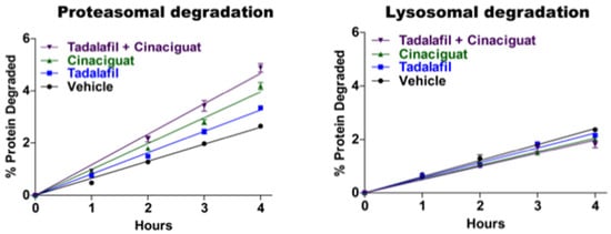 Agents that raise cGMP increase the degradation of proteins by the UPS, but not by autophagy. Proteins in SY5Y cells were prelabeled with 3H-phenylanine for 20 h to label long-lived cell proteins as described previously [62,64]. Proteasomal degradation reflects the net decrease in total protein breakdown in the presence of the proteasome inhibitor bortezomib. Lysosomal degradation represents the net decrease in the presence of the inhibitor of lysosome acidification concanamycin A (adapted from [16]).